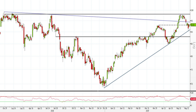 La tendenza nel lungo periodo rimane rialzista dai minimi segnati durante la seconda decade di dicembre 2018. Un ulteriore segnale di forza è poi arrivato con la rottura al rialzo della trendline discendente di lungo periodo che conta i massimi registrati a giugno e settembre 2018, ora transitante a 94 euro, anche se i corsi non sono riusciti ad oltrepassare la resistenza statica a 97,98 euro.