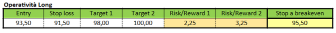 Vista la struttura tecnica di DiaSorin si potrebbero implementare strategie long alla validazione del pattern inside come argomentato precedentemente. Lo stop loss potrebbe essere collocato poco al di sotto del livello di chiusura di venerdì scorso, più precisamente a 91,50 euro. Un primo obiettivo di profitto potrebbe essere collocato sul top di periodo a 98 euro, mentre un target finale a 100 euro.