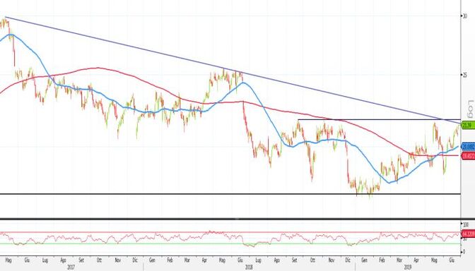 I corsi con la seduta di oggi si sono portati infatti al test della trendline discendente di lungo corso che collega i massimi segnati il 9 maggio 2017 e il 18 maggio 2018, sfiorata con il top assoluto del 2019 registrato il 16 maggio scorso.