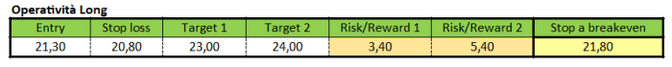 Vista la struttura tecnica di Ferragamo si potrebbero implementare strategie di matrice rialzista in caso di rottura della trendline discendente menzionata nell’analisi, ora transitante a 21,30 euro. In tal caso lo stop loss potrebbe essere collocato a 20,80 euro poco al di sotto del massimo della seduta di ieri. Un primo obiettivo di profitto potrebbe essere collocato a 23 euro, massimo segnato il 20 giugno 2018. Un target finale, invece, potrebbe essere collocato a quota 24 euro per azione.