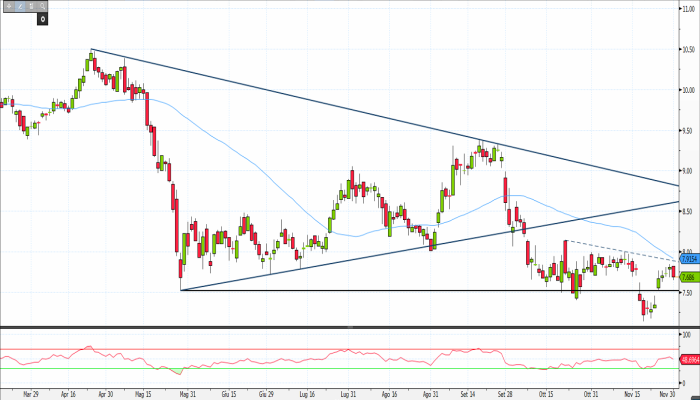 Bisogna inoltre considerare che la tendenza intermedia è ribassista, e che quindi l’ultima ottava di apprezzamento delle quotazioni sia al momento considerabile come un insieme di prese di profitto. I compratori potrebbero infatti attendere il raggiungimento della zona supportiva posta a 7 euro prima di mettere in piedi un movimento più corposo.