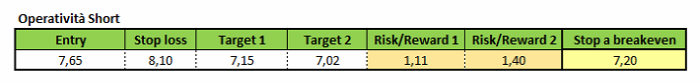 Da quanto emerso dall’analisi, si potrebbero valutare strategie di matrice short con punto di entrata identificabile a 7,65 euro. In questo caso, lo stop loss andrebbe posto a 8,10 euro, l’obiettivo principale a 7,15 euro e l’obiettivo finale a 7,02 euro.