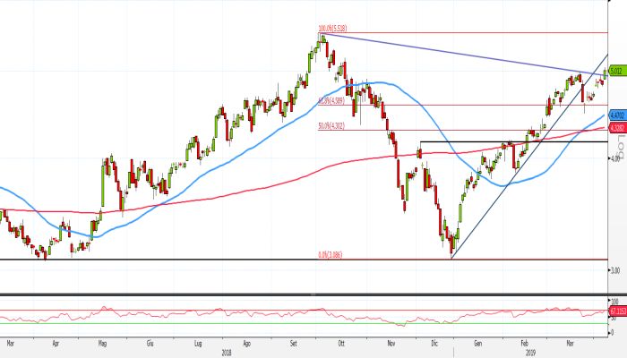 A livello tecnico con il balzo di oggi i corsi si sono portati in prossimità della resistenza statica di breve periodo lasciata in eredità dal massimo segnato lo scorso 21 marzo a 4,9970 euro.