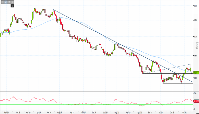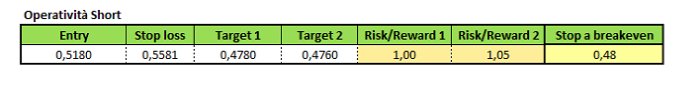 Visto quanto emerso dall’analisi del titolo, si potrebbero adottare strategie in linea con la tendenza principale in caso di un ritorno dei prezzi a 0,518 euro. In questo caso, lo stop loss andrebbe posto a 0,5581 euro, l’obiettivo principale a 0,478 euro e l’obiettivo finale a 0,476 euro.