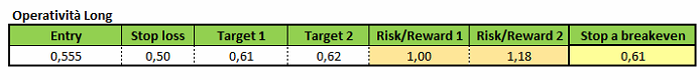 Si potrebbe quindi ipotizzare una presa di respiro da parte dei corsi, che si presterebbe all’implementazione di strategie di matrice long in caso di tenuta del supporto a 0,555 euro.