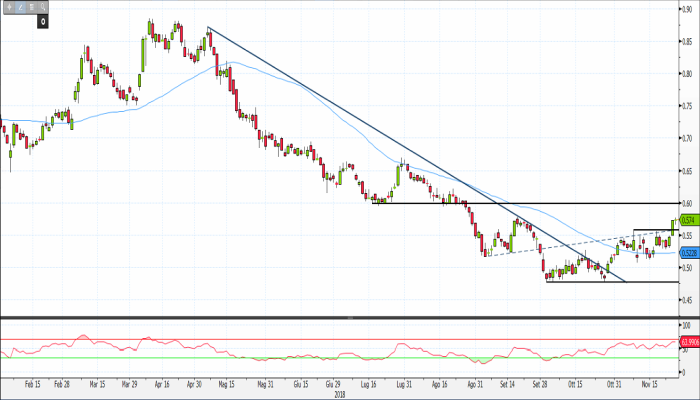 Graficamente si nota come i corsi abbiano effettuato il breakout della congestione con top identificabili a 0,558 euro, fornendo un segnale di forza. La resistenza in questione corrisponde inoltre al transito della linea di tendenza che collega i minimi del 6 a quelli del 7 settembre 2018.