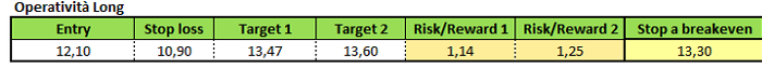 Da quanto emerso dall’analisi, si potrebbero valutare strategie di matrice long sopra 12,10 euro. In questo caso, lo stop loss andrebbe posto a 10,90 euro, l’obiettivo principale a 13,47 e l’obiettivo finale a 13,60 euro.