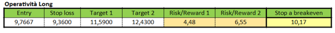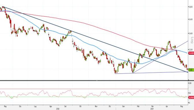 A livello grafico il forte storno che ha registrato il titolo dalla seconda decade di aprile sta portando i corsi in prossimità di un livello dinamico di lungo periodo. Questo livello supportivo conta i minimi segnati il 27 dicembre 2018 e il 4 febbraio 2019, ora transitante a 9,7667 euro.