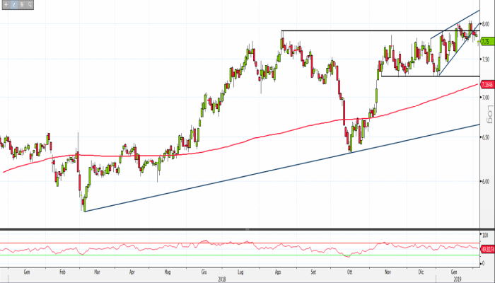 A corroborare l’efficacia di questa figura è la divergenza di inversione bearish sull’oscillatore RSI settato a 14 periodi. L’obiettivo della conformazione tecnica, ottenuto proiettando la sua ampiezza in basso, è individuabile in area 6,80 euro. Questo eventuale ritracciamento permetterebbe alle quotazioni di prendere respiro dopo la forte corsa avuta durante le battute finali del 2018.