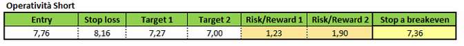 La pulizia della figura tecnica menzionata nell’analisi rende interessante considerare un’operatività di matrice short, in controtendenza. A tal proposito, il punto di entrata si potrebbe individuare a 7,76 euro, lo stop loss a 8,16 euro mentre l’obiettivo principale a 7,32 euro. Il target finale sarebbe invece localizzato a 7,20 euro.