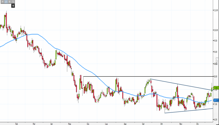 Dopo un forte ribasso, da giugno 2018, il titolo è inserito in una fase di lateralità che, se dovesse venire interrotta, porterebbe ad un movimento direzionale dei corsi. Il livello da monitorare a tal proposito è 7,965 euro, che corrisponde alla parte superiore della lateralizzazione in essere.