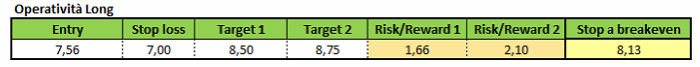 In questo caso, il prezzo medio di carico sarà pari a 7,564 euro. Lo stop loss andrebbe posto a 7 euro, l’obiettivo principale a 8,50 euro e l’obiettivo finale a 8,75 euro.
