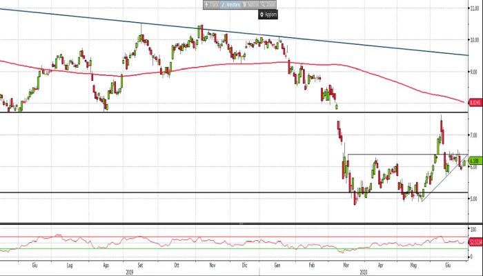 Dopo essere stati respinti dal livello statico originato dai minimi del 27 dicembre 2018, a 7,70 euro, i corsi hanno iniziato a correggere parte della fase ascendente, portandosi verso la soglia psicologia dei 6 euro. La discesa ha permesso ai venditori di passare sia al di sotto del supporto a 6,38 euro, che della linea di tendenza ottenuta collegando i lows del 22 maggio a quelli del 12 giugno 2020.
