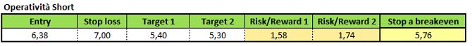 Operativamente, si potrebbero valutare strategie di natura short da 6,38 euro, con stop loss localizzabile a 7 euro e obiettivo principale a 5,40 euro. Il target finale sarebbe invece identificato a 5,30 euro.