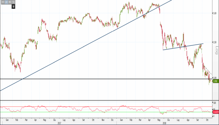 Le quotazioni sono ora ad un punto cruciale, dato dalla soglia dei 2 euro ad azione: tale supporto è infatti sia importante soglia psicologica, che grafica.
