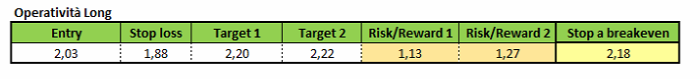 Lo stop loss andrebbe posto a 1,88 euro mentre l’obiettivo principale a 2,20 euro. L’obiettivo finale sarebbe invece localizzato a 2,22 euro.