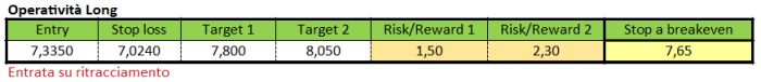 In mancanza di elementi tecnici al di sopra dei livelli attuali, un primo obiettivo di profitto potrebbe essere collocato a 7,800 euro, mentre un target finale sui massimi registrati oggi a 8,050 euro.
