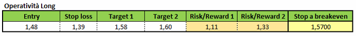 L’importanza dell’area supportiva identificata nell’analisi potrebbe rendere interessante valutare una strategia di matrice long da 1,48 euro, condizionando quindi l’entrata a una decisa ripresa di forza. Lo stop loss andrebbe posto al di sotto di 1,39 euro, mentre l’obiettivo principale a 1,58 euro. Il target finale sarebbe invece identificabile a 1,60 euro.