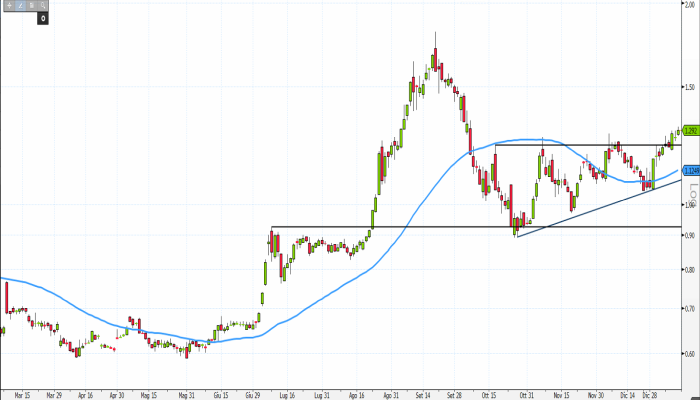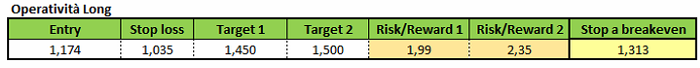 Lo stop loss andrebbe posto a 1,035 euro, l’obiettivo principale a 1,45 euro e l’obiettivo finale a 1,50 euro.