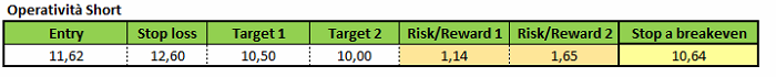 Operativamente, si potrebbero privilegiare strategie di matrice short in caso di retest dell’ex intorno supportivo di 11,62 euro. In questo caso, lo stop loss andrebbe posto a 12,60 euro, l’obiettivo principale a 10,50 euro e l’obiettivo finale a 10 euro ad azione.