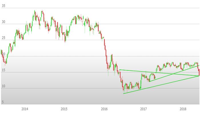 L’analisi del titolo su un grafico con timeframe settimanale evidenzia inoltre come in prossimità degli attuali valori di prezzo, l’azione Unicredit scambi vicino al transito di due distinte trendline supportive. Una ottenuta con i minimi crescenti di luglio e agosto 2016, l’altra disegna con i massimi decrescenti dell’ultima settimana di maggio 2016 e quelli di fine marzo 2017.