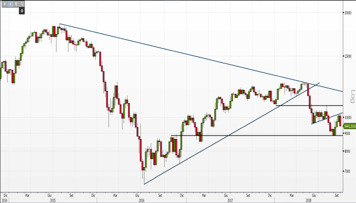 L’impulso rialzista iniziato la prima settimana di luglio 2016, evidenziato dalla linea di tendenza ascendente che ha sostenuto i corsi fino a maggio 2018, ha infatti riportato le quotazioni in prossimità della strategica soglia resistenziale di matrice statica lasciata in eredità dai minimi del novembre 2014 e gennaio 2015. Violata al ribasso a fine gennaio 2016, da allora detta soglia resistenziale ha sempre ostacolato le velleità rialziste dell’indice. A dimostrarne la strategicità la serie di top registrati in prossimità dei 12.485 punti a cavallo tra gennaio e metà maggio di quest’anno.