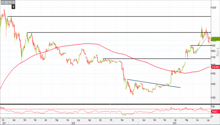 La discesa che ha portato le quotazioni a ridosso del supporto in essere ha permesso ai venditori di effettuare la violazione della linea di tendenza che unisce i lows del 10 giugno a quelli del 2 luglio 2019. In questo modo, le quotazioni sono ora inserite in un range la cui rottura potrebbe determinare un’accelerazione dei prezzi.