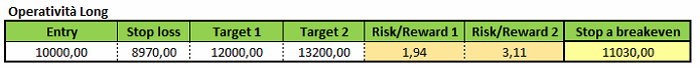 Operativamente, si potrebbe seguire il forte uptrend in cui sono inserite le quotazioni per implementare strategie di stampo long da 10.000 dollari. In questo caso, lo stop loss andrebbe posto al di sotto di 8.970 dollari, mentre l’obiettivo principale a 12.000 dollari. Il target più ambizioso andrebbe invece posto a 13.200 dollari.
