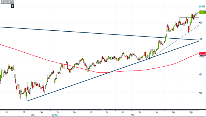 La direzione dei corsi sembra essere la chiusura del gap menzionato prima, anche se è ragionevole attendersi un ritracciamento in area 141,60 euro: nel caso in cui ciò dovesse accadere, i compratori avrebbero la possiblità di sfruttare l’occasione per cercare di entrare nel solido trend ascendente.