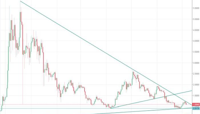 Se è vero che sul grafico a 30 minuti con il cedimento dei supporti statici di breve posti a 1,10 è stato completato un doppio massimo avente come obiettivo al ribasso area 0,95, è altresì vero che proprio la soglia target del double top è un livello storicamente molto importante per la criptovaluta.