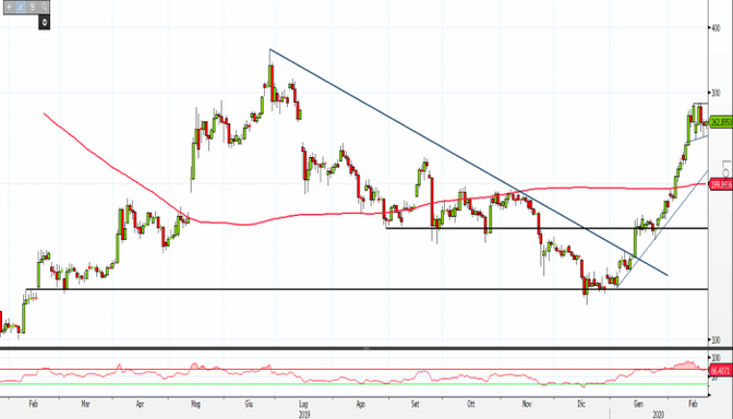 Le quotazioni si sono poi fermate in area 285 dollari, dopo aver chiuso il gap down del 15 luglio 2019 e aver raggiunto il 61,8% del ritracciamento di Fibonacci disegnato dai top del 26 giugno ai lows del 18 dicembre 2019.
