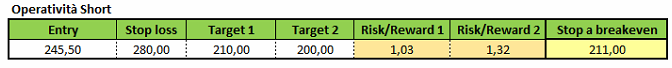 Da un punto di vista operativo, si potrebbero valutare strategie di natura short da 245,50 dollari. Lo stop loss sarebbe invece identificabile a 280 dollari, mentre l’obiettivo principale a 210 dollari. Il target finale è invece localizzato a 200 dollari.