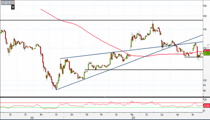 Graficamente, la struttura del rialzo iniziato a fine 2018 si è deteriorata in maniera importante, come indica la discesa al di sotto del 61,8% del ritracciamento di Fibonacci disegnato dai lows del 14 dicembre 2018 ai top del 26 giugno 2019.