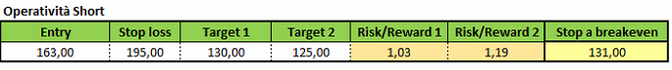 Da un punto di vista operativo, si potrebbero valutare strategie di matrice short (in linea con la tendenza) da 163 dollari. Lo stop loss andrebbe posto sopra i 195 dollari, mentre l’obiettivo principale a 130 dollari. Il target finale sarebbe invece identificabile a 125 dollari.