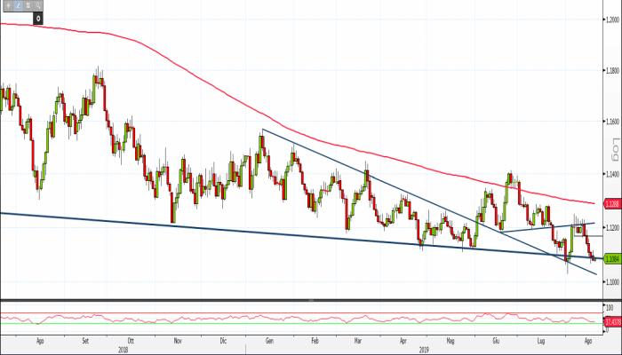 Nelle scorse sedute, dopo essere state respinte dalla trendline ottenuta con i lows del 18 giugno e del 17 luglio 2019, le quotazioni hanno rotto il livello di concentrazione di domanda a 1,1168, mettendo a segno una serie di cinque barre negative di fila. I corsi sono quindi giunti all’ultimo baluardo che le separa dal supporto a 1,0874, lasciato in eredità dai top dell’8 dicembre 2016.