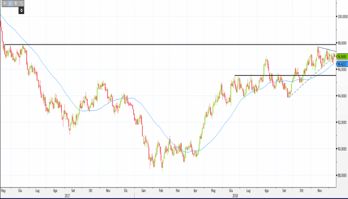 Sul chart giornaliero si iniziano ad osservare i primi segnali di perdita di smalto del fronte rialzista a ridosso del livello statico di 97,85 punti. Questa resistenza, lasciata in eredità dai massimi del 19 maggio 2017, corrisponde al 61,8% del ritracciamento di Fibonacci del movimento discendente con massimi al 3 gennaio 2017 e minimi al 16 febbraio 2018. In analisi tecnica questa zona, che corrisponde a circa tre quarti dell’intero impulso, separa un rimbalzo da una vera e propria inversione di tendenza.
