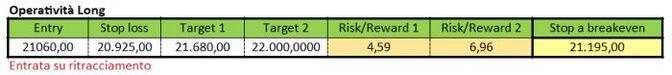 In tal caso lo stop loss potrebbe essere collocato poco al di sotto del minimo segnato il 25 marzo scorso, più precisamente a 20.925 punti.