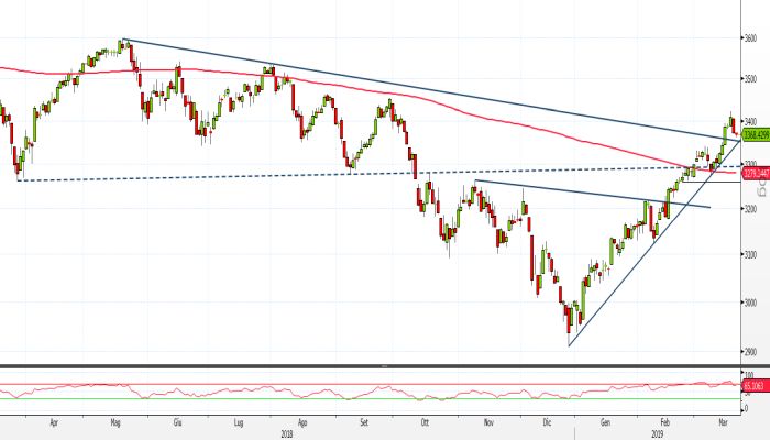 Con il ribasso segnato ieri e proseguito nella giornata odierna, i corsi sono arrivati al test della trendline discendente di lungo periodo che conta i massimi segnati il 23 gennaio 2018 con l’high segnato il 18 maggio 2018, rispettivamente a 3.687,22 punti e a 3.596,20 punti, ora transitante a 3.359,68 punti.