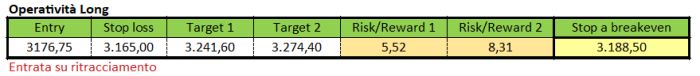 Lo stop loss per questo tipo di operatività potrebbe essere collocato poco al di sotto della chiusura registrato nella giornata dell’11 febbraio, più precisamente a 3.165 punti, livello che se invalidato comprometterebbe la view rialzista.