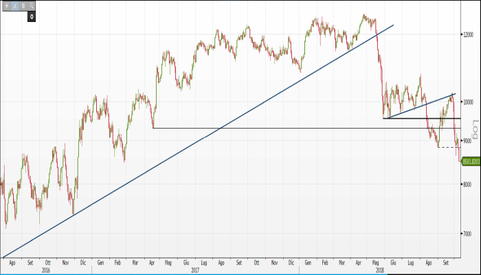*Il 74% dei conti degli investitori retail perde denaro negoziando CFD con questo fornitore. È necessario valutare se si può sostenere il rischio elevato di perdere il capitale investito.Le incertezze sul piano politico, riferite in particolar modo alla questione Def e rapporto deficit/pil ha fatto spaventare gli investitori istituzionali, che dallo scorso 28 settembre hanno spinto l’indice bancario italiano verso i nuovi minimi annuali di 8.500 punti, raggiunti nella seduta odierna. I corsi potrebbero ora effettuare un veloce rimbalzo che darebbe la possibilità per adottare delle strategie operative in linea con la tendenza principale.