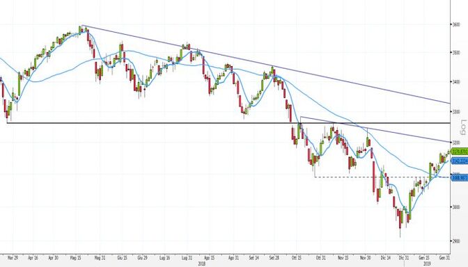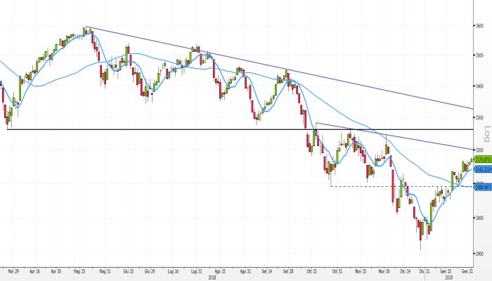 In particolare, osservando il grafico giornaliero si può notare come i corsi nel loro movimento ascendente partito dai minimi segnati il 27 dicembre a 2.908,70 punti, abbiano proseguito senza evidenti movimenti correttivi, rispettando inoltre la media mobile a 8 giorni che ha funzionato bene da supporto dinamico dal 14 al 17 gennaio e successivamente il 23 gennaio.