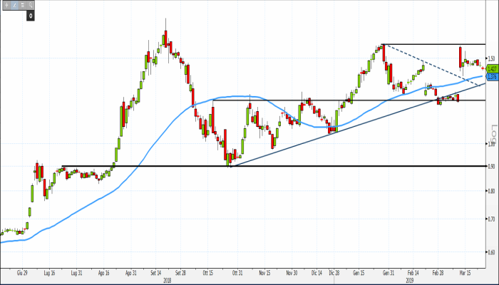 Le quotazioni sembrano ora puntare al supporto di 1,35 euro, dove transitano la media mobile semplice a 50 giorni e la linea di tendenza che collega i minimi del 26 ottobre a quelli del 27 dicembre 2018. Negli ultimi mesi, questi due livelli si sono sempre rivelati validi catalizzatori di acquisti, e potrebbero essere quindi sfruttati per valutare strategie operative in linea con l’uptrend principale.