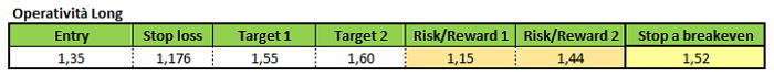 La struttura grafica del titolo in Borsa si presta all’implementazione di strategie di matrice long da 1,35 euro. Lo stop loss sarebbe identificabile a 1,176 euro, mentre l’obiettivo principale a 1,55 euro. Un target più ambizioso si troverebbe invece a 1,60 euro, zona che corrisponde al test della coriacea resistenza statica menzionata nel corso dell’analisi.