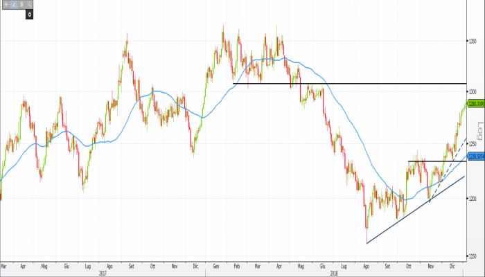 Un altro elemento che potrebbe mettere in difficoltà, almeno momentaneamente, l’avanzata dei compratori è dato dalla soglia psicologica dei 1.300 dollari e, successivamente, dalla resistenza a 1.307,17 dollari.