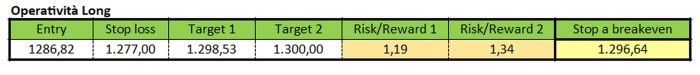 Alla luce de trend sottostante del metallo giallo si potrebbero implementare strategie di matrice rialzista. In particolare, una violazione al rialzo della mediana di Bollinger ora a 1.286,82 dollari l’oncia potrebbe fornire un segnale long che avrebbe come primo obiettivo la resistenza statica a 1.298,53 dollari l’oncia. Un target finale potrebbe invece essere collocato in prossimità del livello tondo dei 1.300 dollari l’oncia. Lo stop loss per questo tipo di operatività potrebbe essere collocato poco al di sotto della banda inferiore di Bollinger, più precisamente a 1.277 dollari l’oncia.