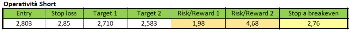 Lo stop loss potrebbe essere collocato poco al di sopra del massimo registrato nella seduta di ieri, più precisamente a 2,85 dollari.