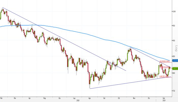 Da questo livello i prezzi hanno successivamente formato un nuovo impulso ribassista che ha riportato i corsi a segnare un minimo a 778,70 dollari l’oncia, dove i corsi hanno successivamente proseguito con bassa volatilità prima del breakout rialzista messo a segno il 4 gennaio.