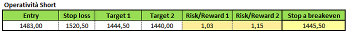 Visto quanto emerso dall’analisi tecnica, si potrebbero valutare strategie di natura short nel breve periodo, mirando ad una prosecuzione del ritracciamento in atto e non a un’inversione di tendenza. A tal proposito, un possibile punto di entrata sarebbe identificabile a 1.483 dollari l’oncia, lo stop loss a 1.520,50 dollari e l’obiettivo principale a 1.444,5 dollari. Il target finale sarebbe invece identificabile a 1.440 dollari.