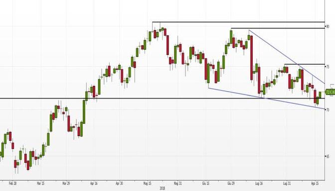 Il cuneo discendente è visibile nella sua parte superiore collegando i massimi segnati il 10 luglio a quota 79,51 dollari e i recenti massimi segnati il 7 agosto a 74,90 dollari, nella sua parte inferiore, invece, collegando i minimi segnati nelle sedute del 16 giugno a 72,45 dollari, il 17 luglio a 71,35 dollari ed infine l’ultimo minimo della seduta di Ferragosto a 70,30 dollari al barile.
