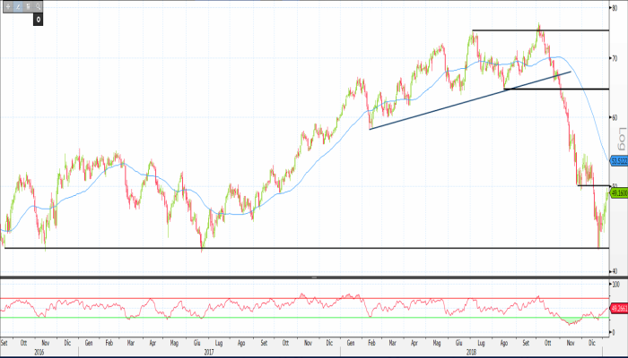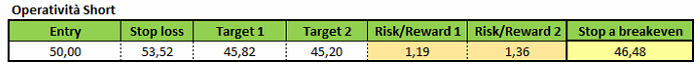 Visto che le quotazioni sono ormai giunte nei pressi di un livello di concentrazione di domanda così importante come quello dei 50 dollari, si potrebbero valutare strategie di matrice short con punto di entrata sulla resistenza, stop loss a 53,52 dollari e obiettivo principale a 45,82 dollari. In questo contesto, l’obiettivo finale è individuabile a 45,20 dollari.